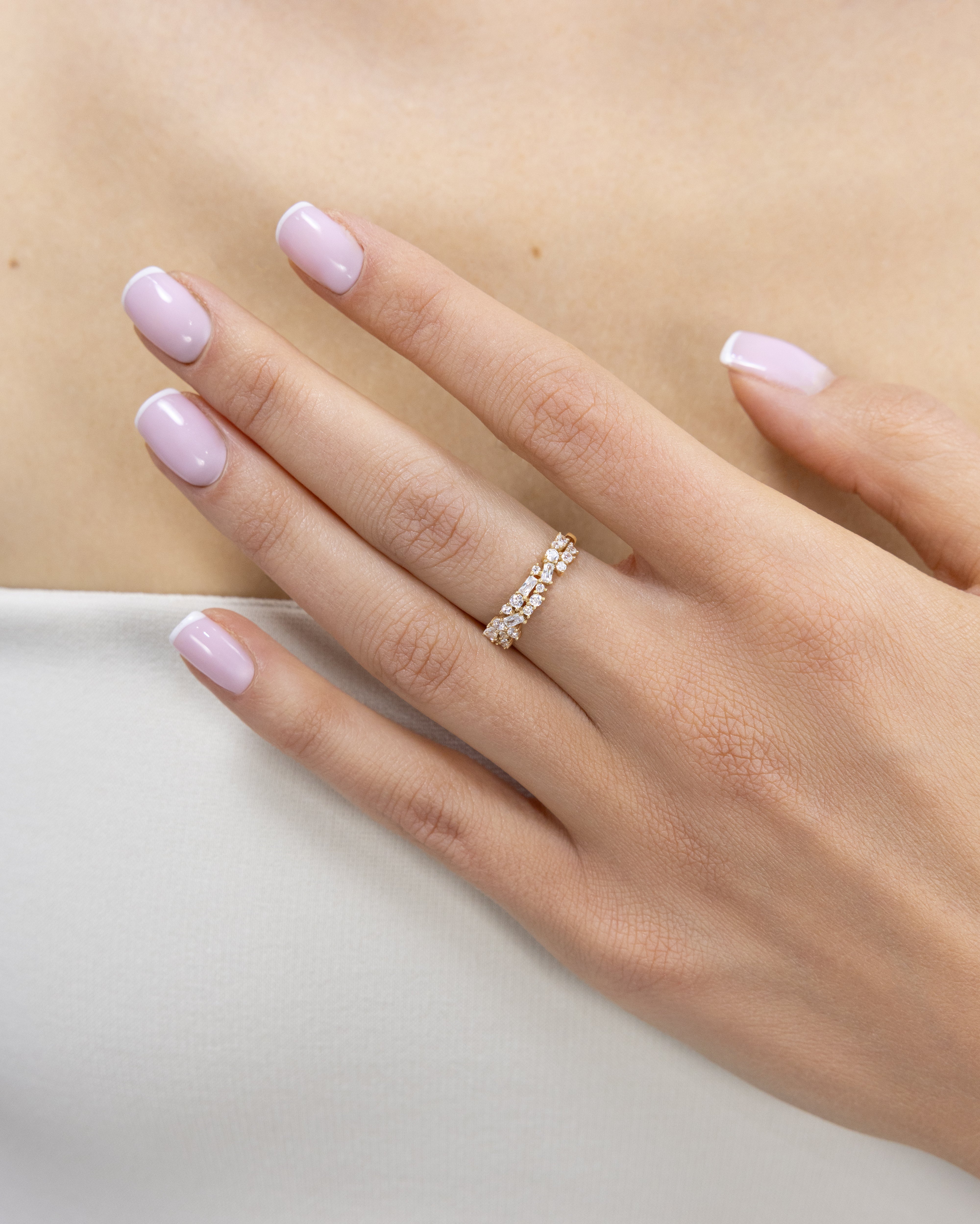 Discover our Ophelie ring, with its band-like design that embodies timeless elegance. This ring is adorned with a delicate interlacing of sparkling white oxides, adding a touch of sophistication to your finger. Wear the Ophelie ring with pride and let it illuminate your hand with its incomparable charm.